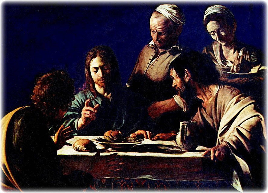 He went in with them as a guest. They sat by the fire and talked while supper was prepared. When it was ready, the three of them sat down together. No one asked or questioned as he took the bread and spoke the words of blessing. Then he broke it and gave it to them with that delight upon his face which was always there when he could give something to his children. In that moment it was as if an unfelt hand had been taken from their eyelids, as if suddenly the film had been cleared from their sight.